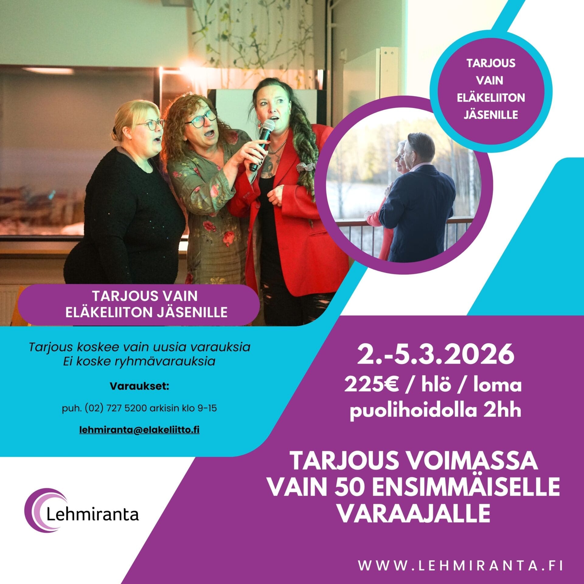 Lehmirantaan voi saapua viikonloppulomalle puolihoitovuorokauden hintaan ympäri vuoden. Kaikki pariskunnat, henkilöautoryhmät ja omaan tahtiin lomailevat ovat lämpimästi tervetulleita.